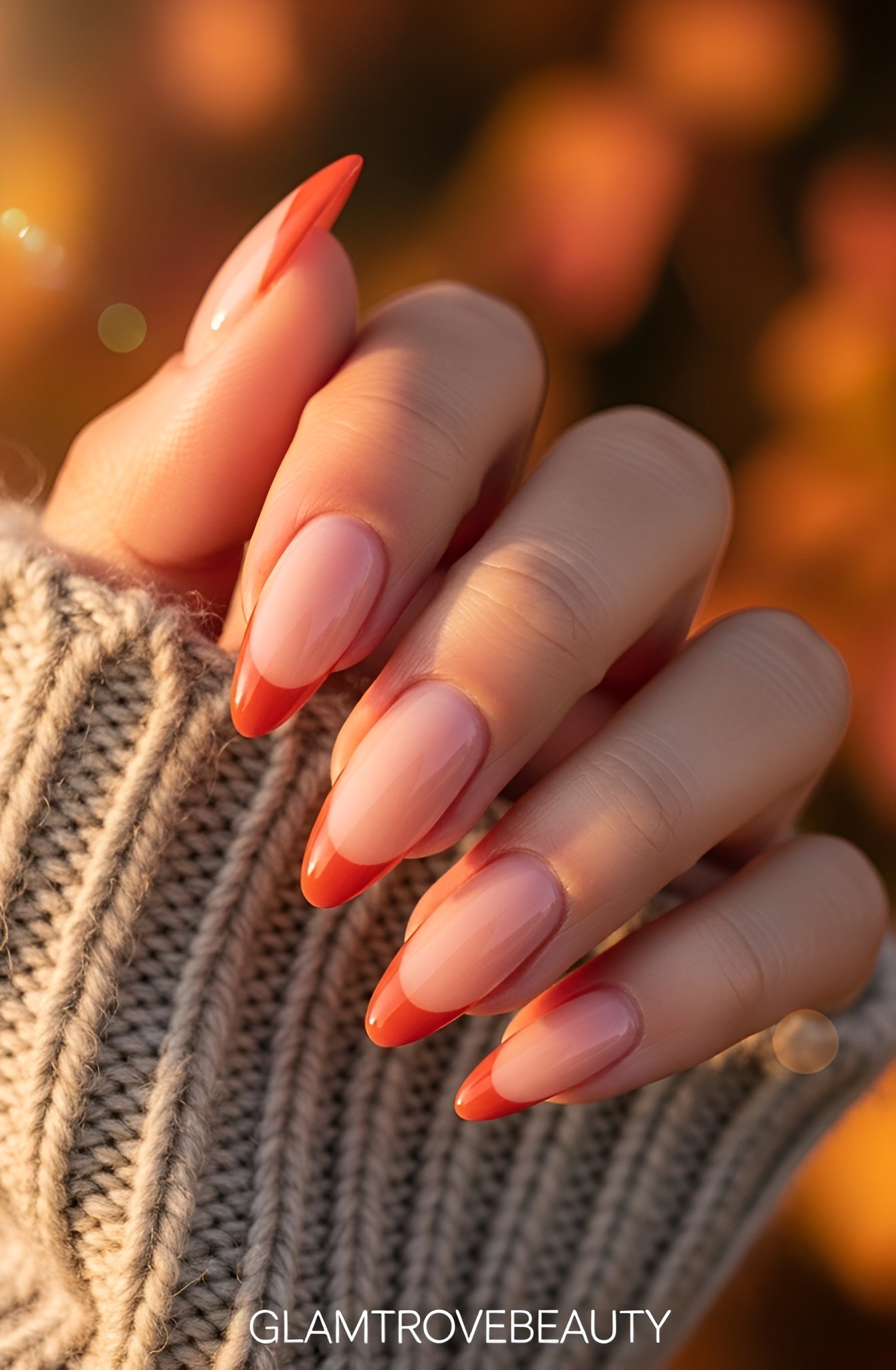 A fall twist on a classic! Burnt orange tips bring warmth and vibrance to neutral nails โ perfect for almond or square shapes. This color flatters every skin tone and pairs beautifully with cozy sweaters and spiced lattes.