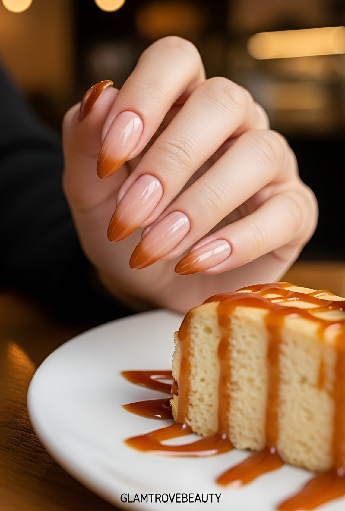 Transition from nude to caramel in a smooth ombrรฉ fade. Itโs simple, subtle, and sweet โ a perfect transitional nail for early fall.