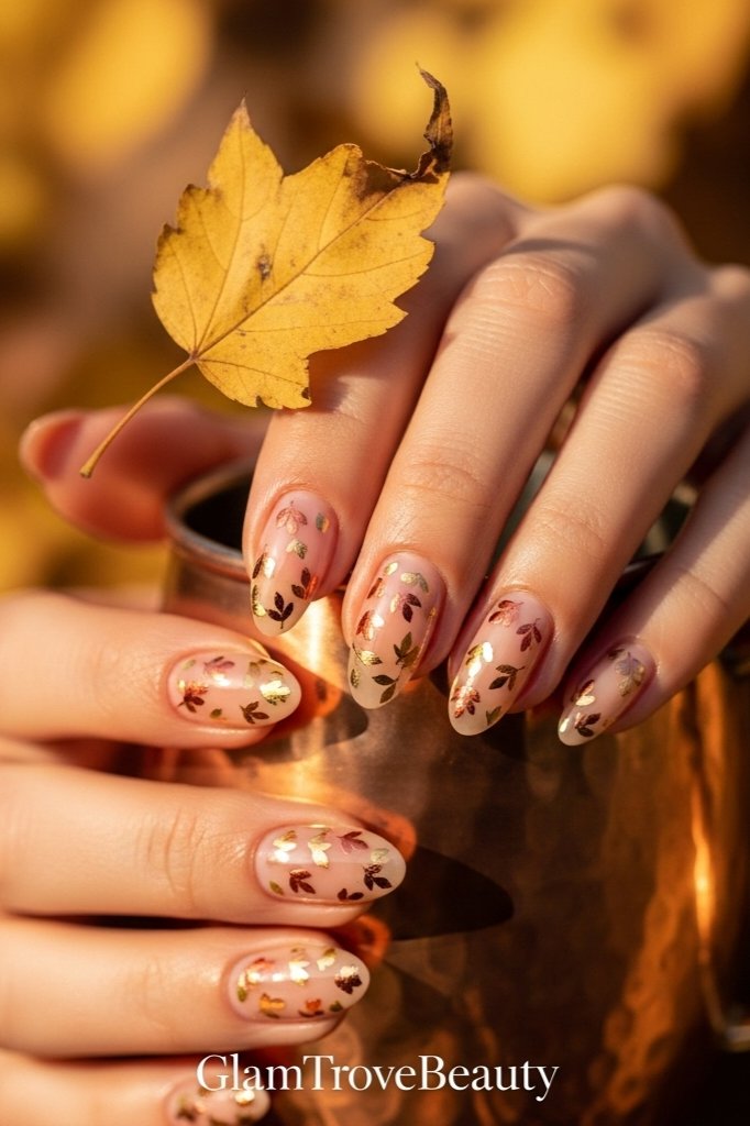 Tiny painted or foil leaves in copper and gold make for an ethereal fall manicure. Great on sheer nude bases for an airy, elegant feel.