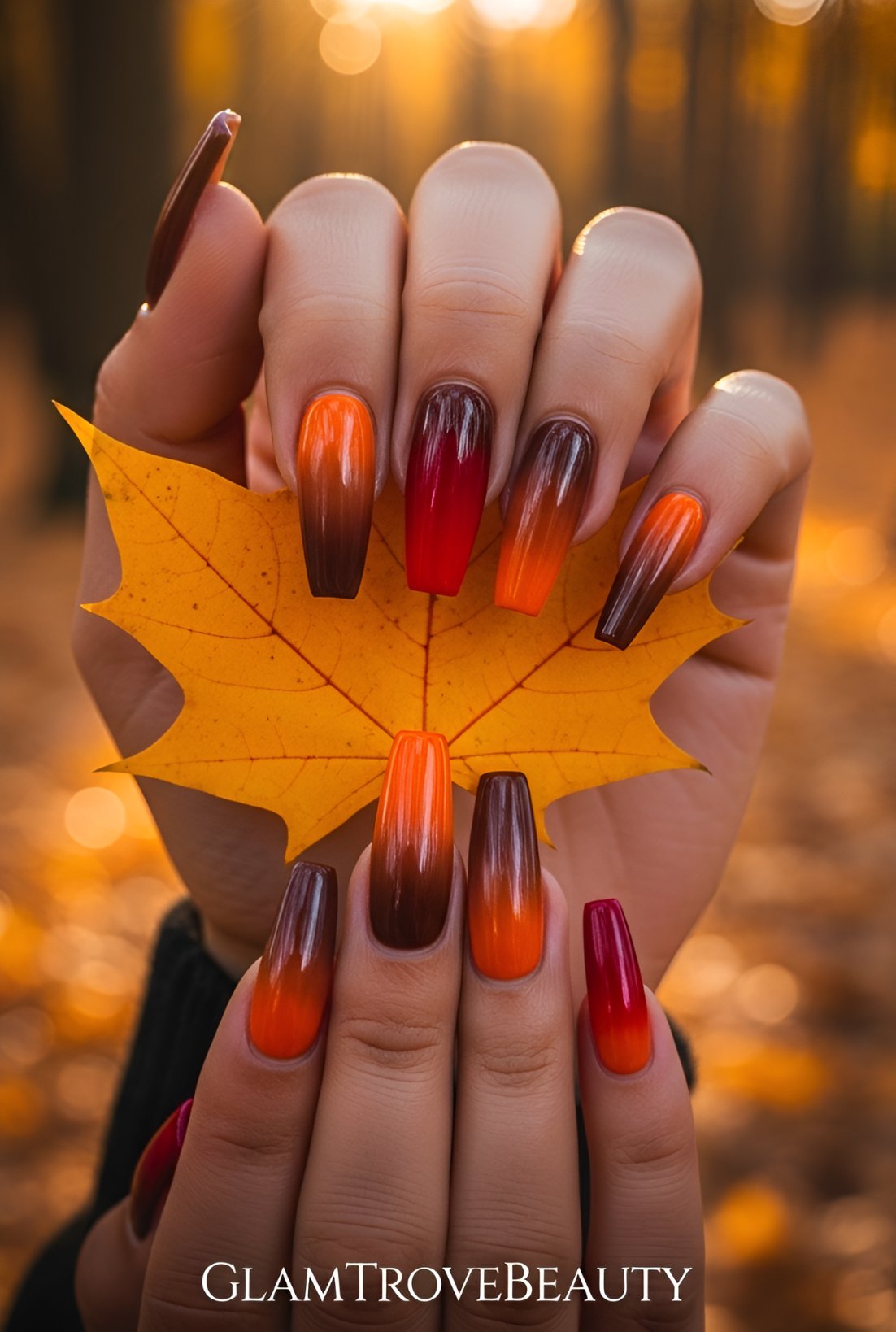 A smoky aura effect in fall colors like orange, brown, and red gives depth and magic to your mani. Stunning on longer nails.