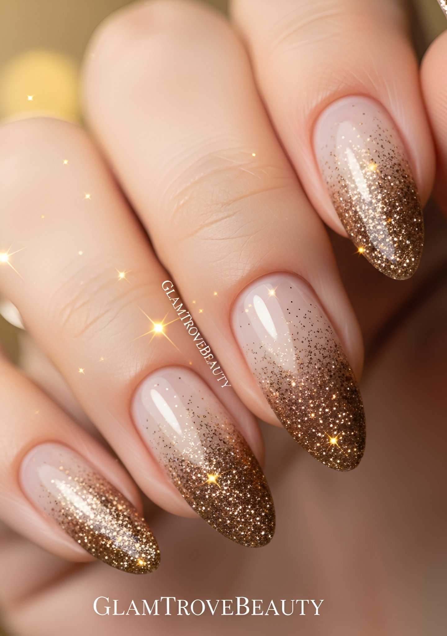 Bronze glitter starts strong at the base and fades to clear at the tips for a sparkling ombrรฉ that mimics falling leaves.