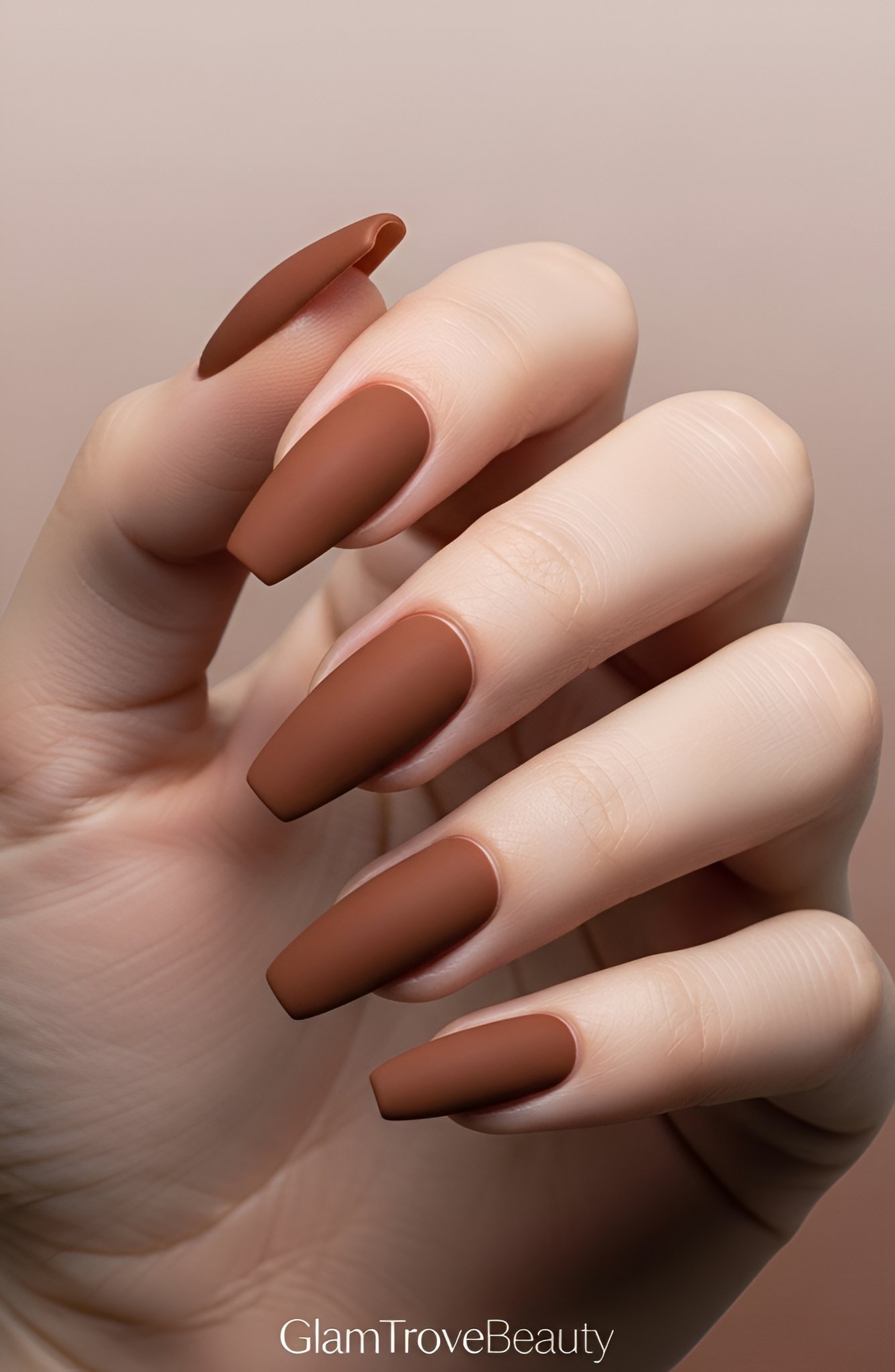 Matte cinnamon polish on long coffin nails is bold and cozy. Pair with gold rings and chunky sweaters for full glam.