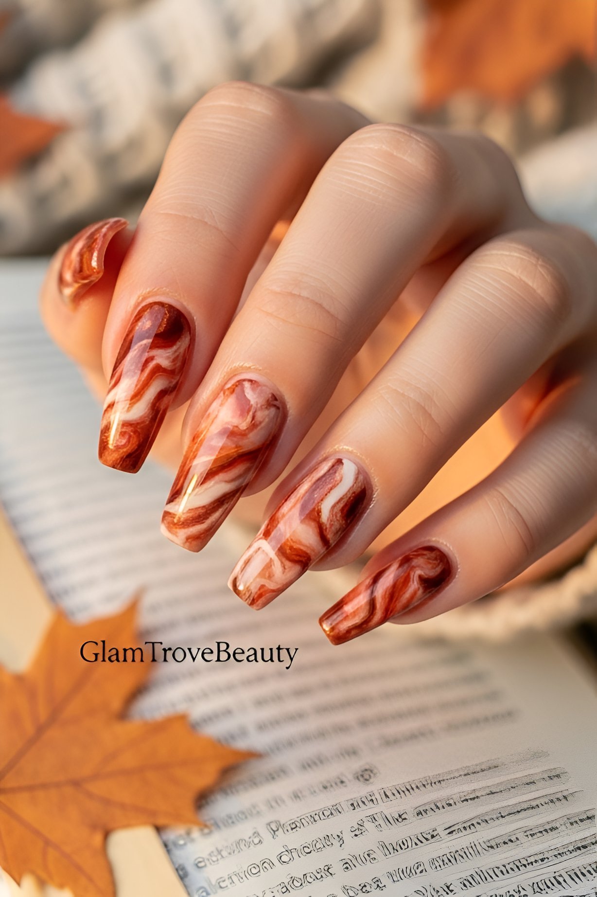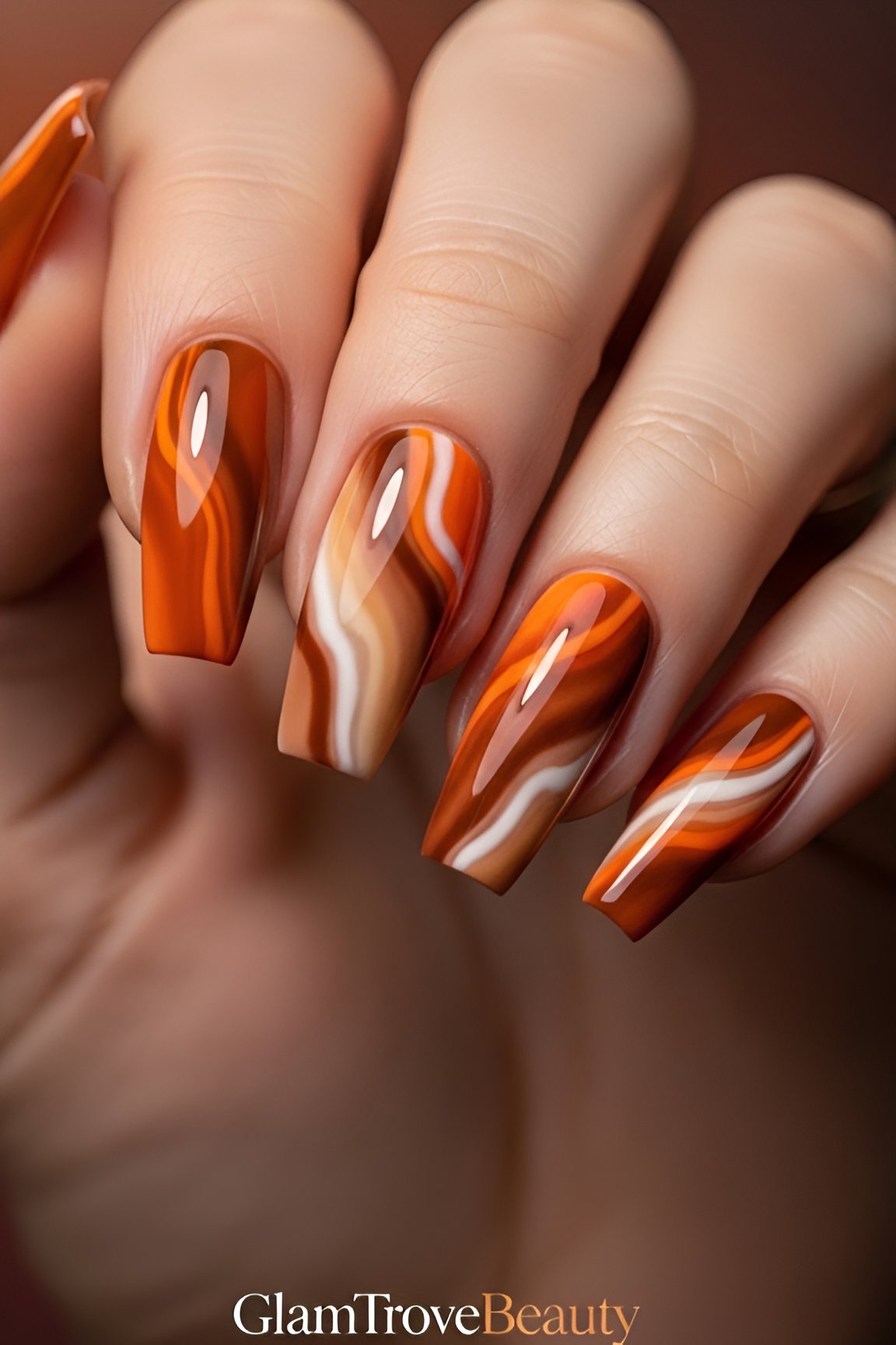 Swirled rust, cream, and copper tones create an abstract, elegant effect. Great for square or coffin nails and especially flattering with chunky knit outfits.