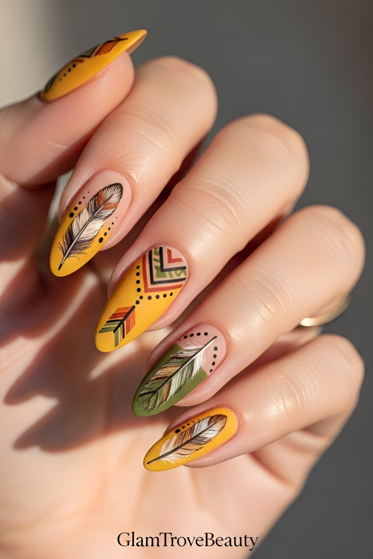 Think feathers, arrows, and earthy patterns in mustard, sienna, and olive tones. These nails capture that wild, free autumn spirit.