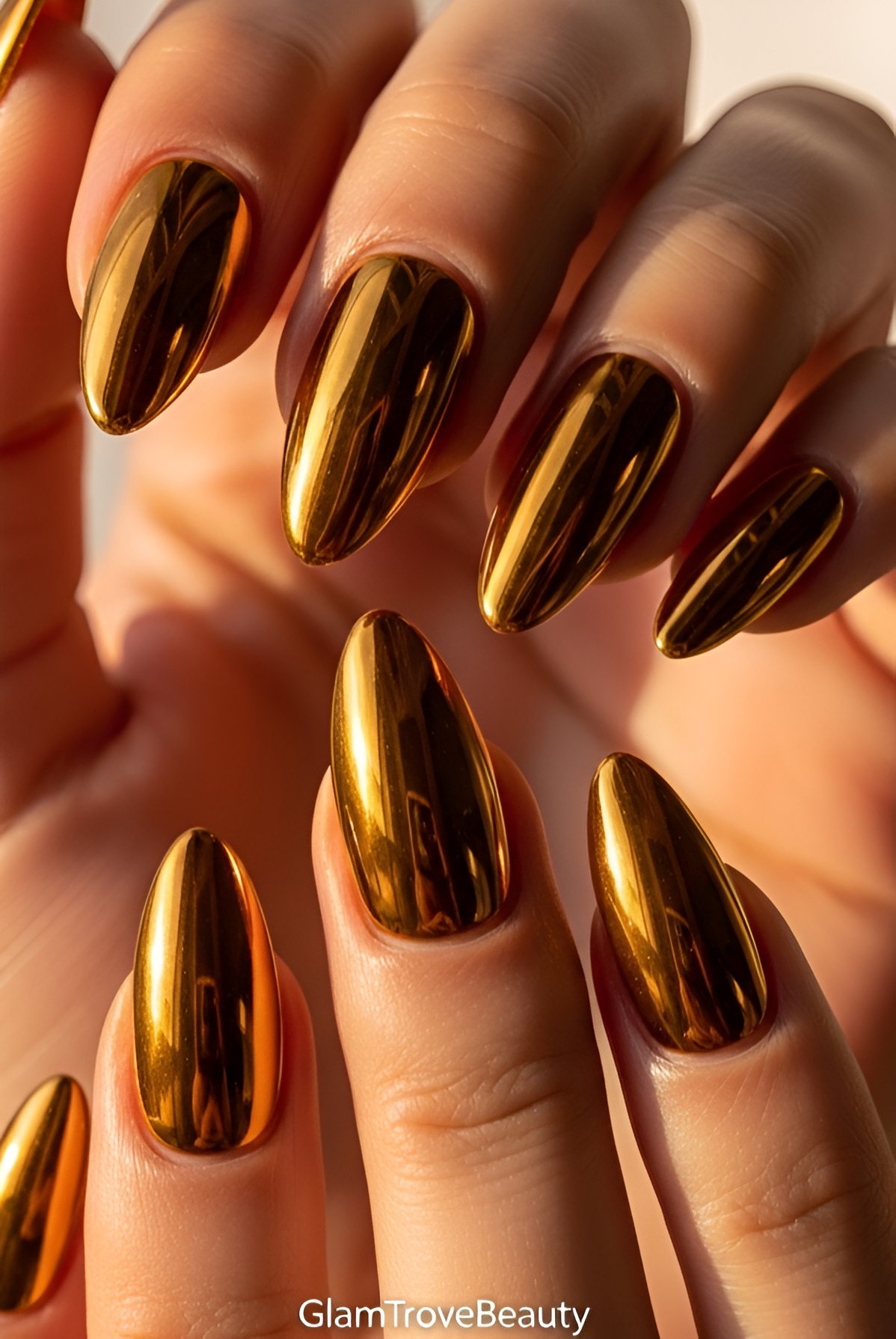 Dark chrome shades like gunmetal, chocolate, and bronze give off sultry vibes. Add a high-gloss top coat for a mirror-like shine.