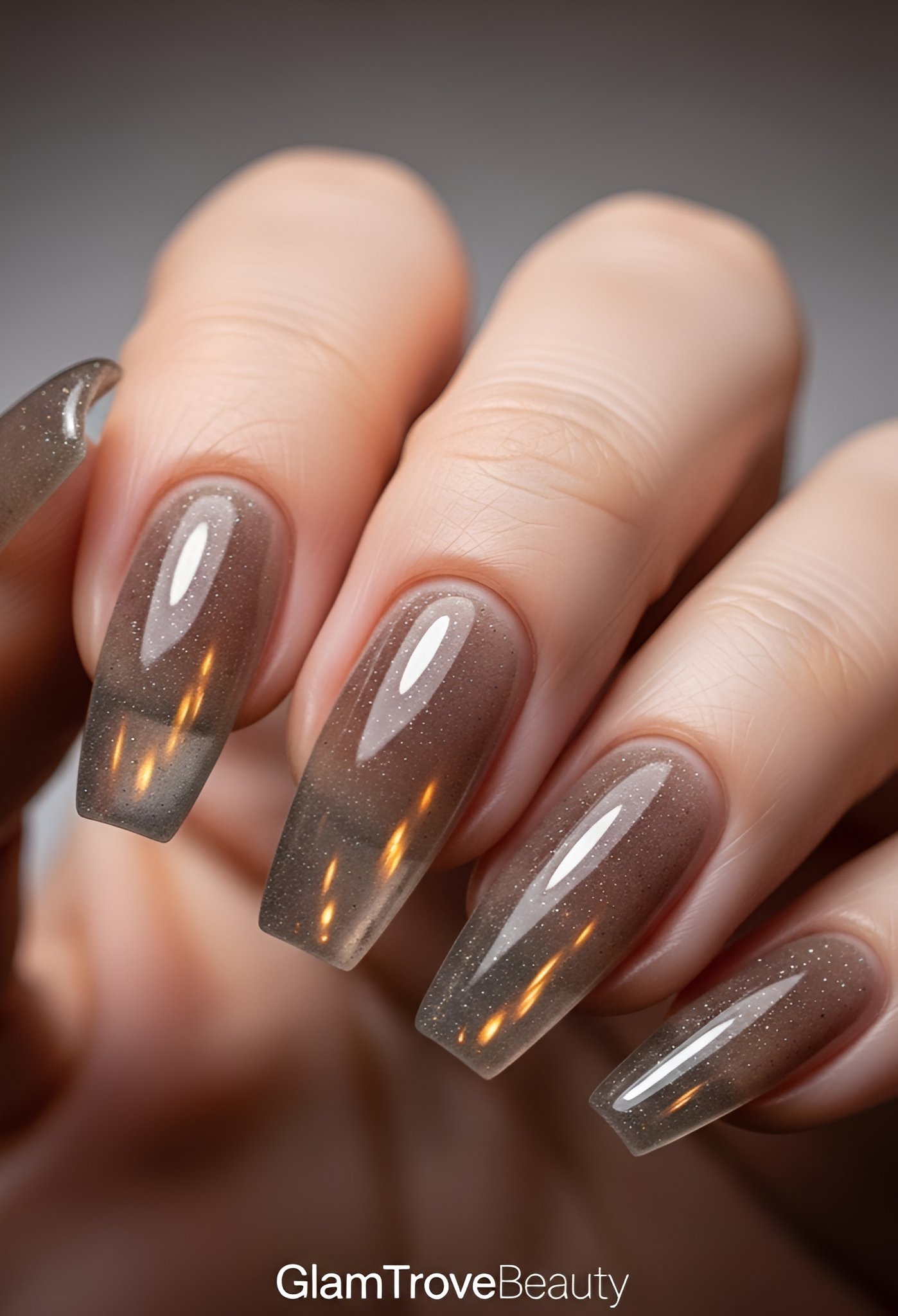 Translucent taupe and gray polish mimics smoky quartz crystals โ mysterious, moody, and magical for fall.