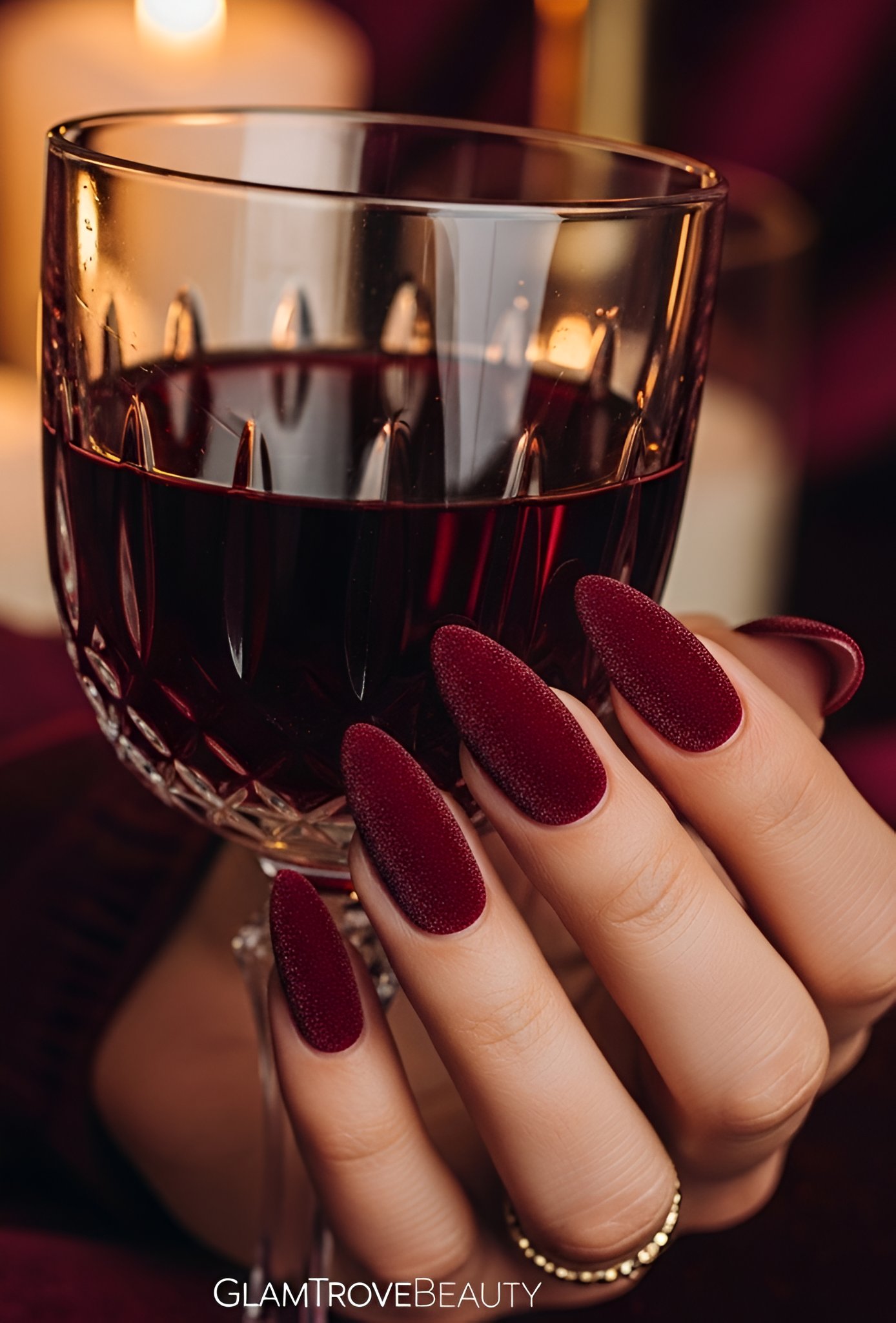 Deep and dramatic, velvet-textured wine red nails add instant luxe. Try flocking powder or shimmer polish for that soft, plush look.